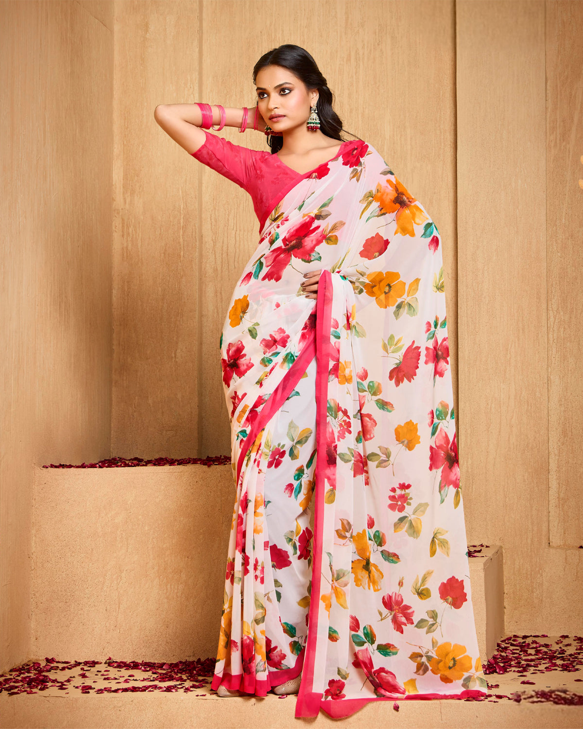 Soft floral motifs on airy jorjet fabric create a serene, graceful look, ideal for semi-formal occasions that call for understated elegance.