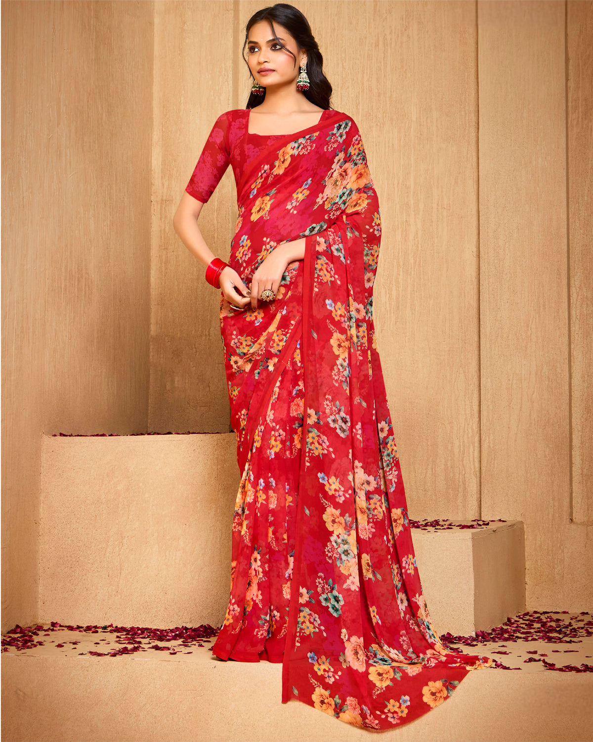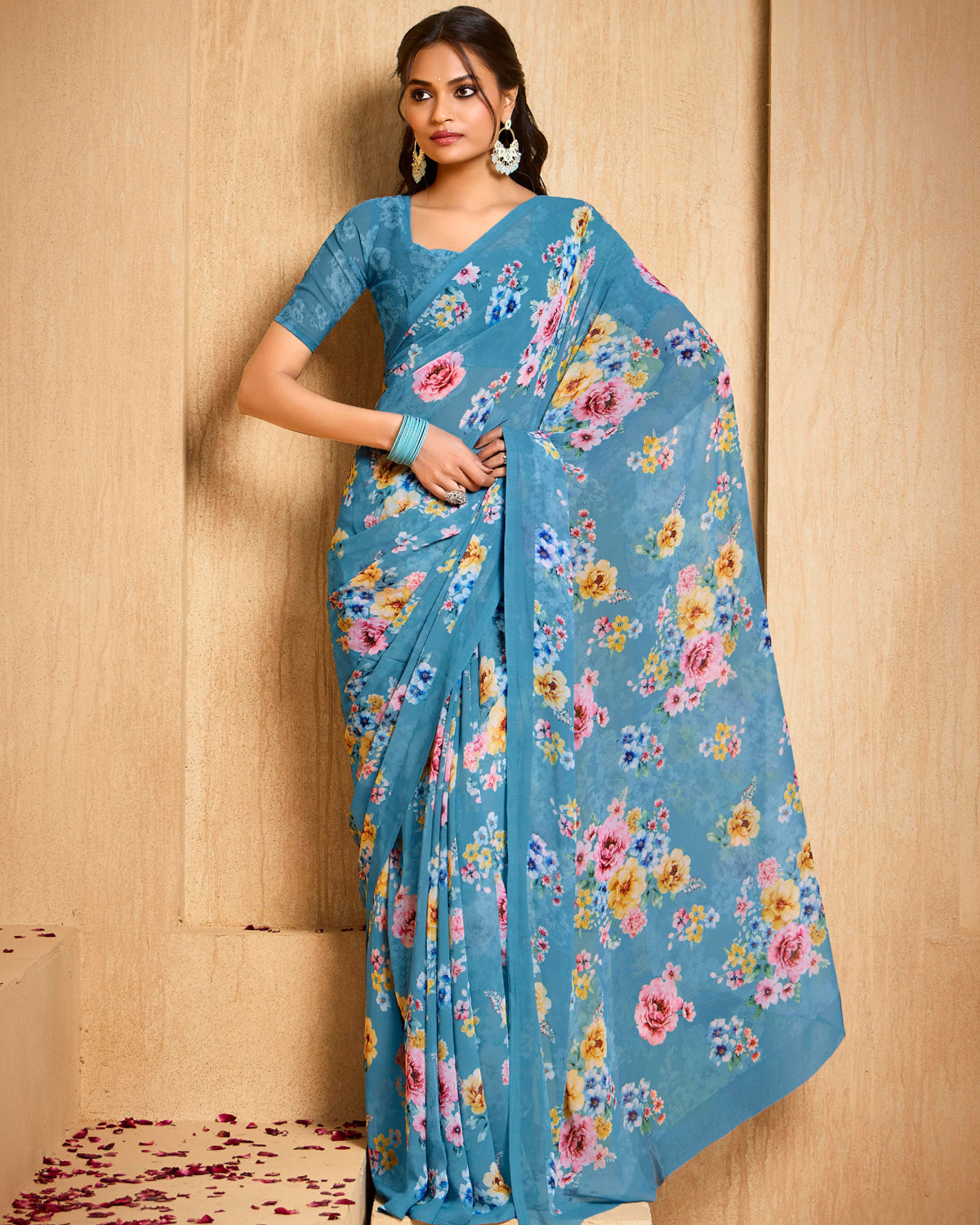 This soft, flowing jorjet saree brings charm to every occasion with its subtle floral prints, creating a refined and feminine silhouette that’s ideal for semi-formal settings.