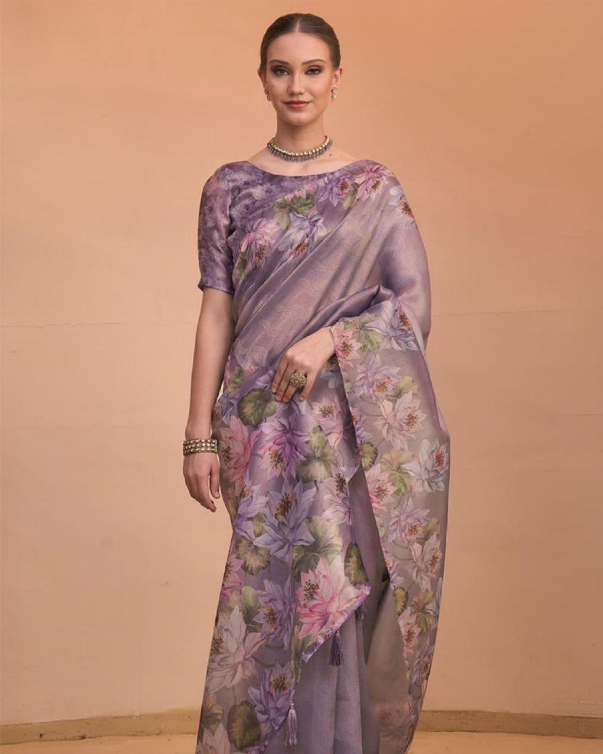A saree that speaks of timeless beauty – Noorika Tissue Printed Saree shines with its soft golden sheen and delicate prints. Lightweight yet regal, it adds effortless grace to festive evenings and grand celebrations.