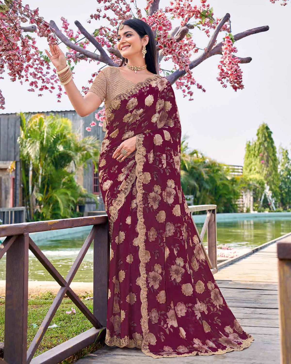 Draped in soft chiffon, adorned with delicate flower prints like a garland of blossoms.