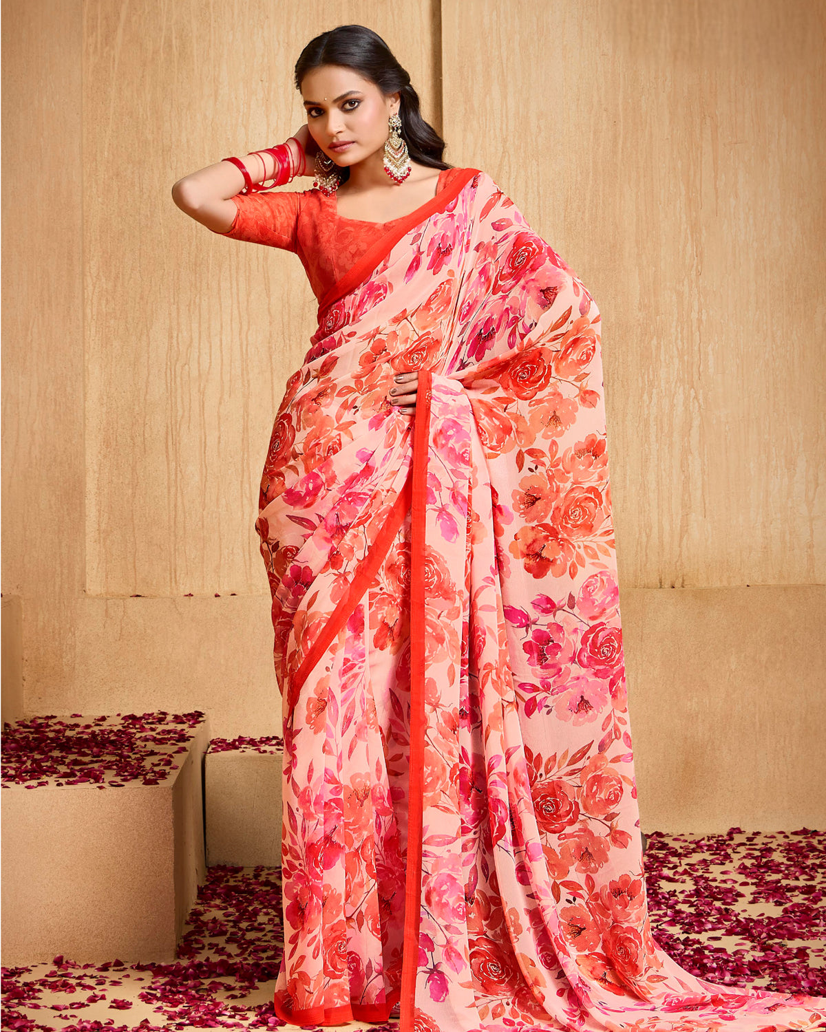 Lightweight and breezy, this floral jorjet saree balances subtle sophistication with effortless charm, making it ideal for semi-formal occasions.