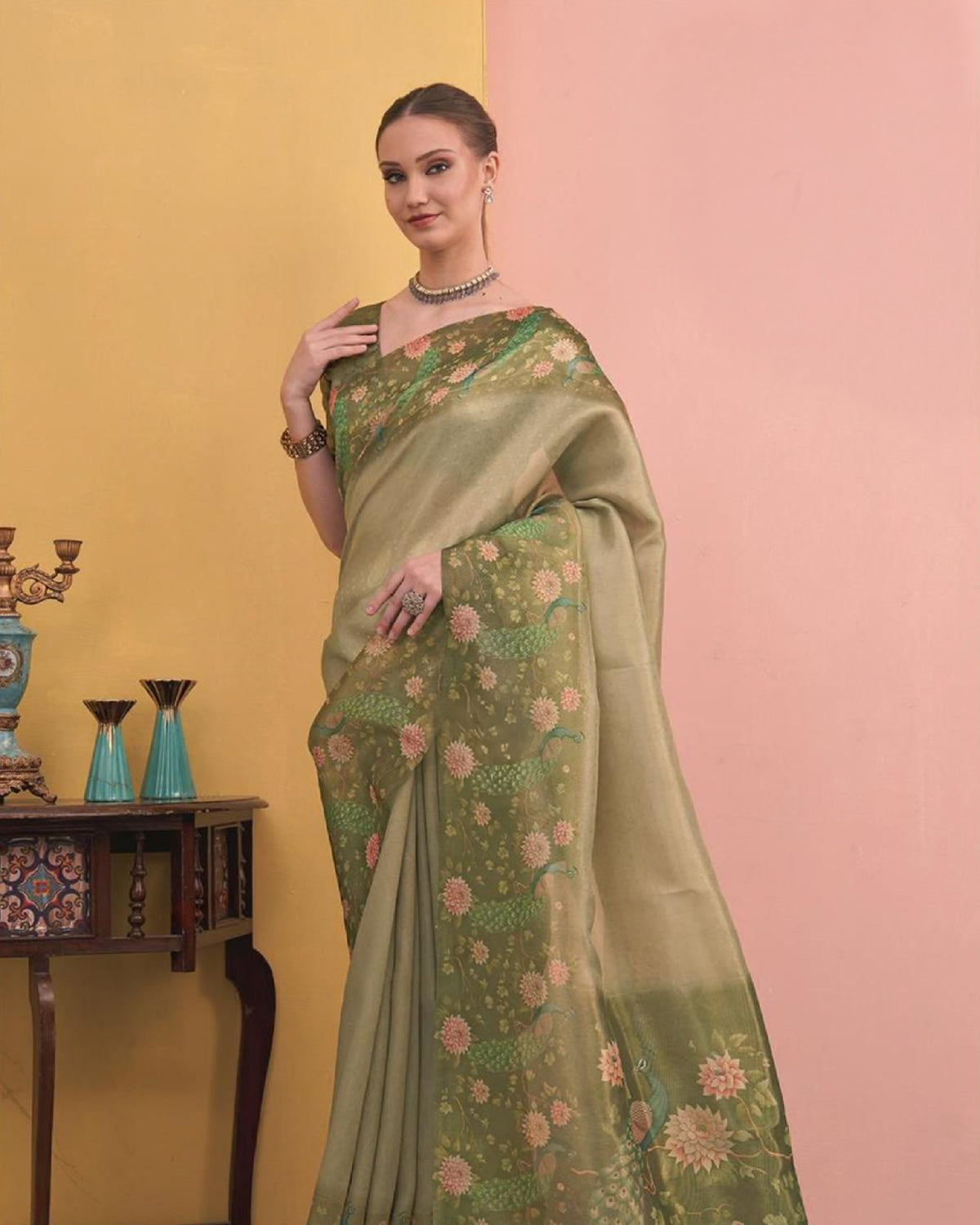 Vistara Tissue Printed Saree is crafted for women who love grandeur. With its luminous shine and intricate prints, it offers a royal yet lightweight drape.