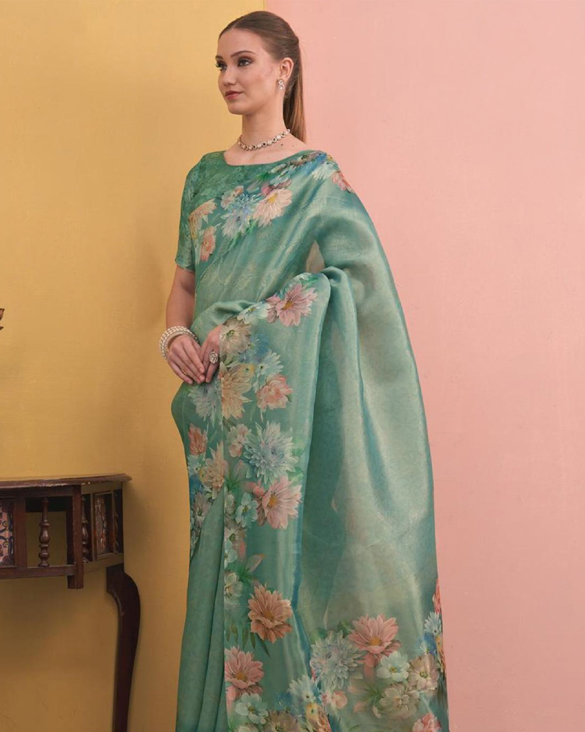 Zinnira is a masterpiece in tissue fabric – shining, soft, and adorned with artistic prints. A saree that embodies luxury and is ideal for weddings, parties, and festive nights.