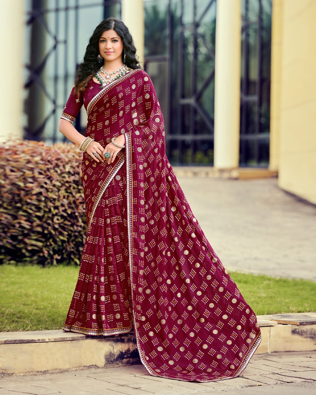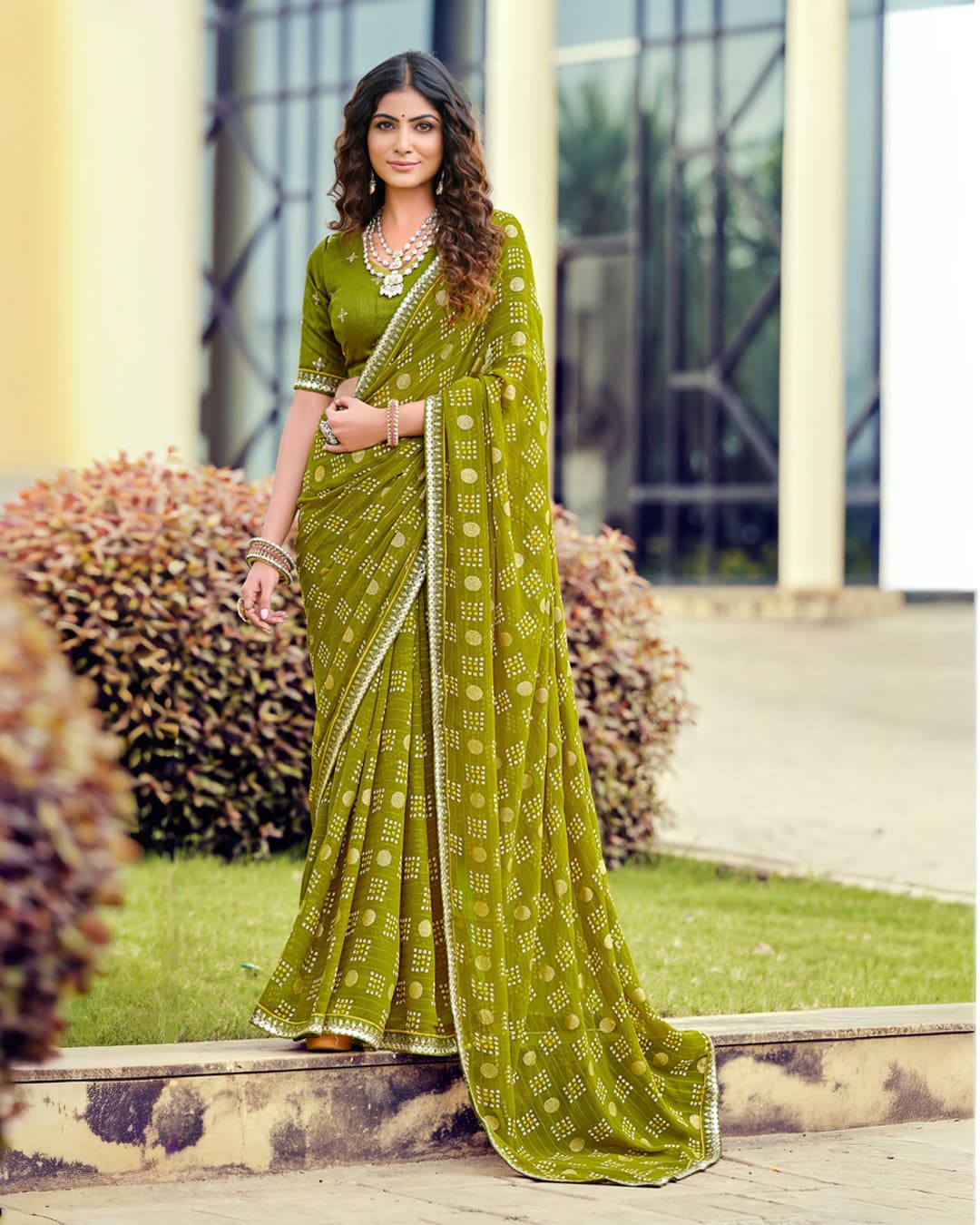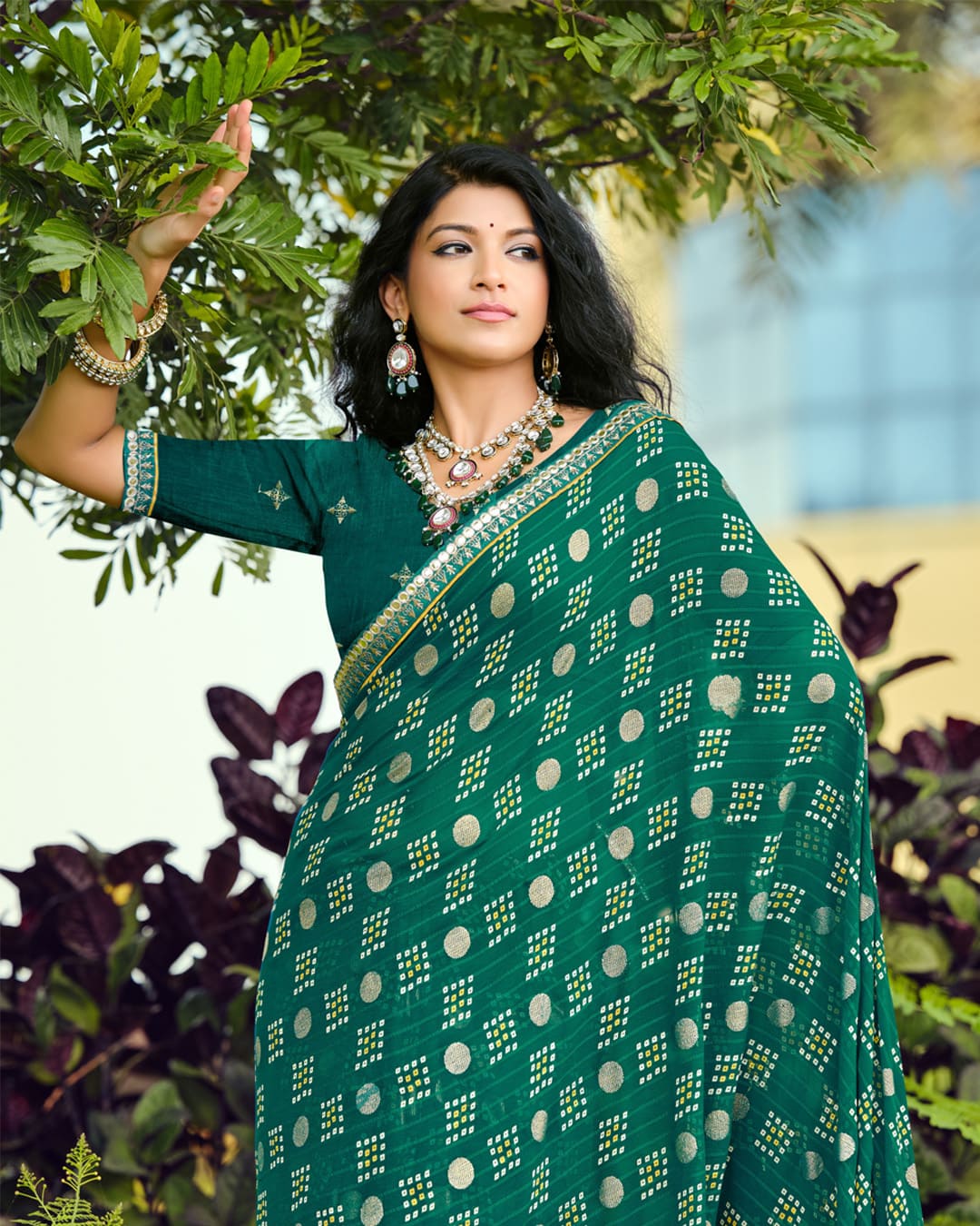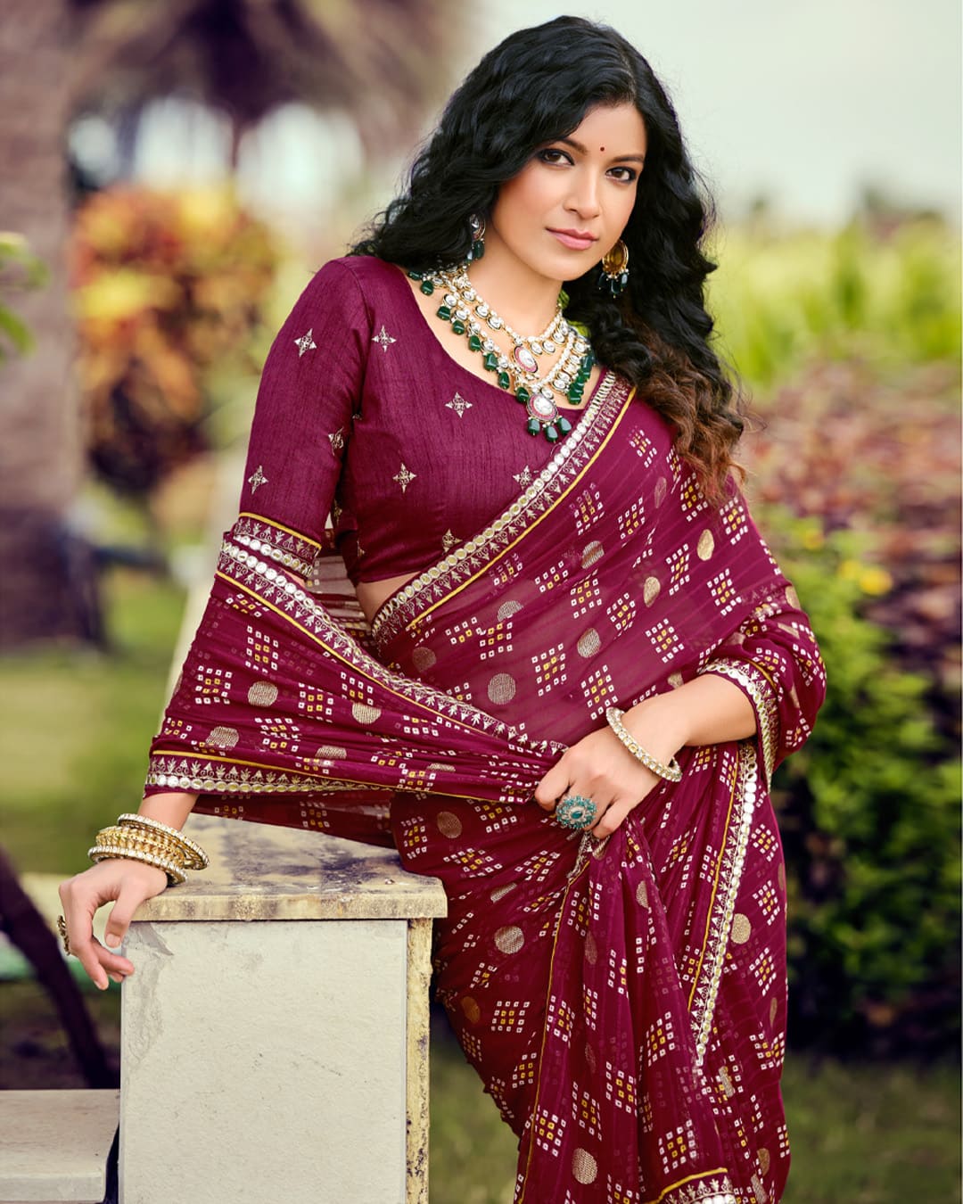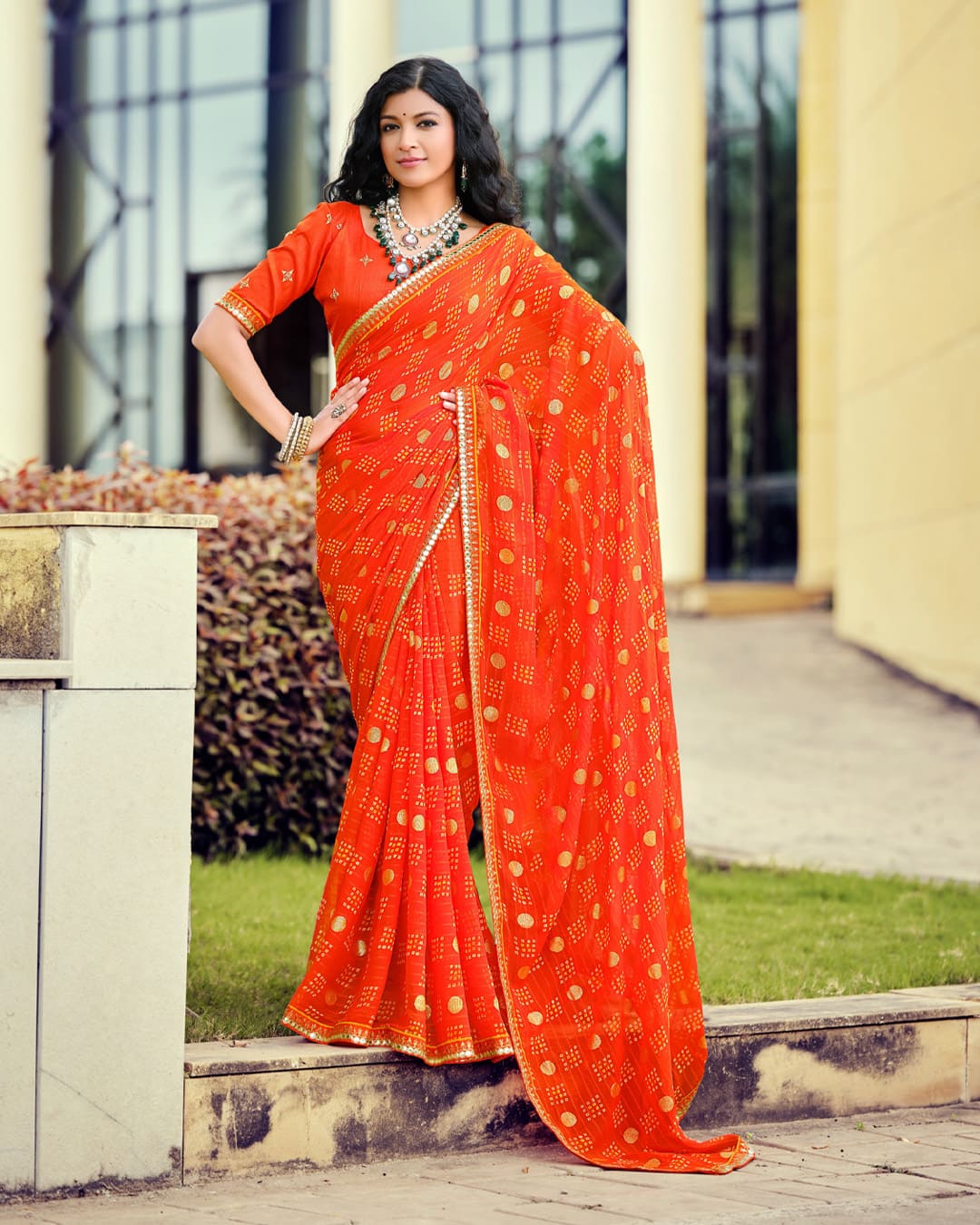 A splash of multi-coloured bandhej patterns on smooth georgette adds vibrancy and festive energy to your look.