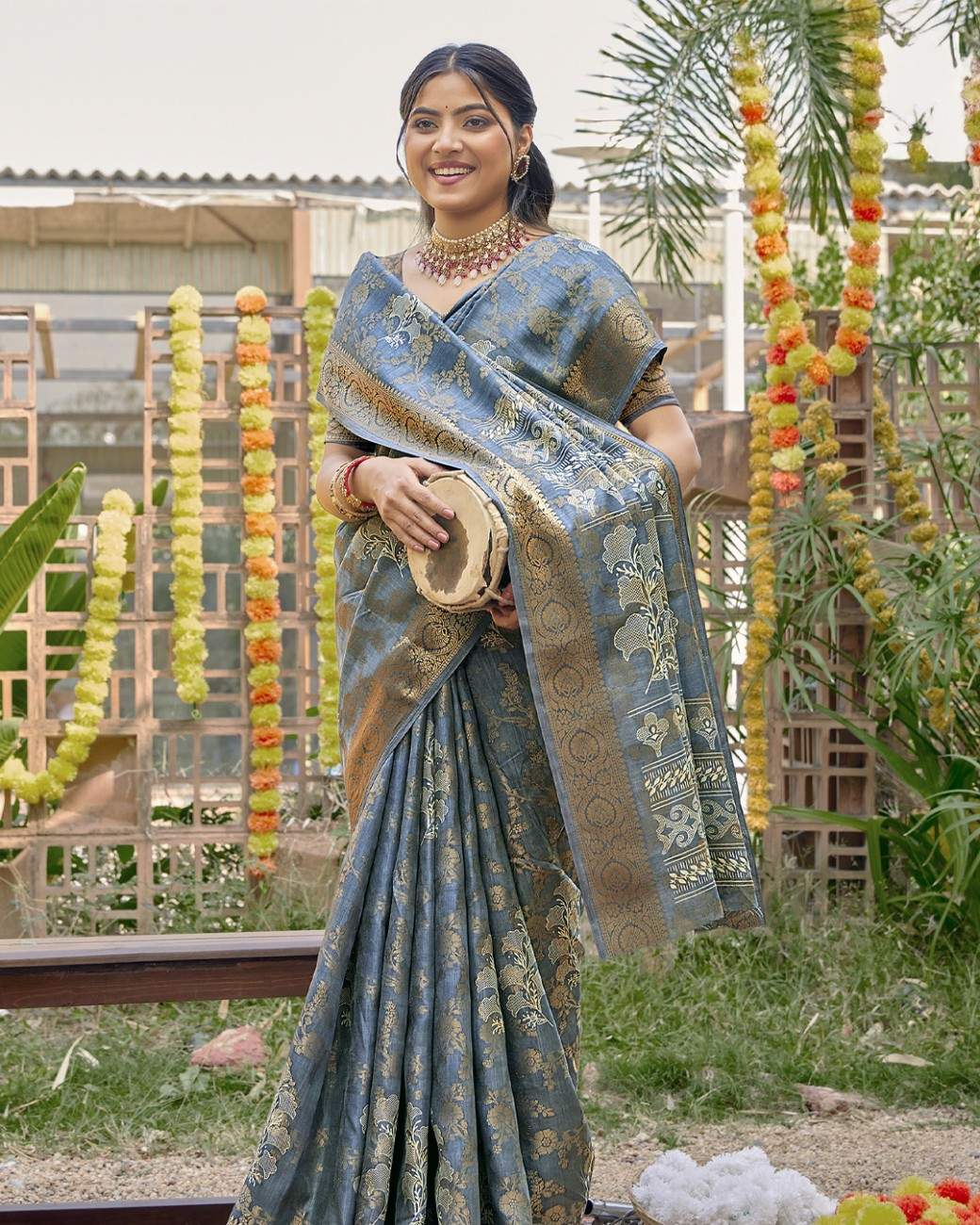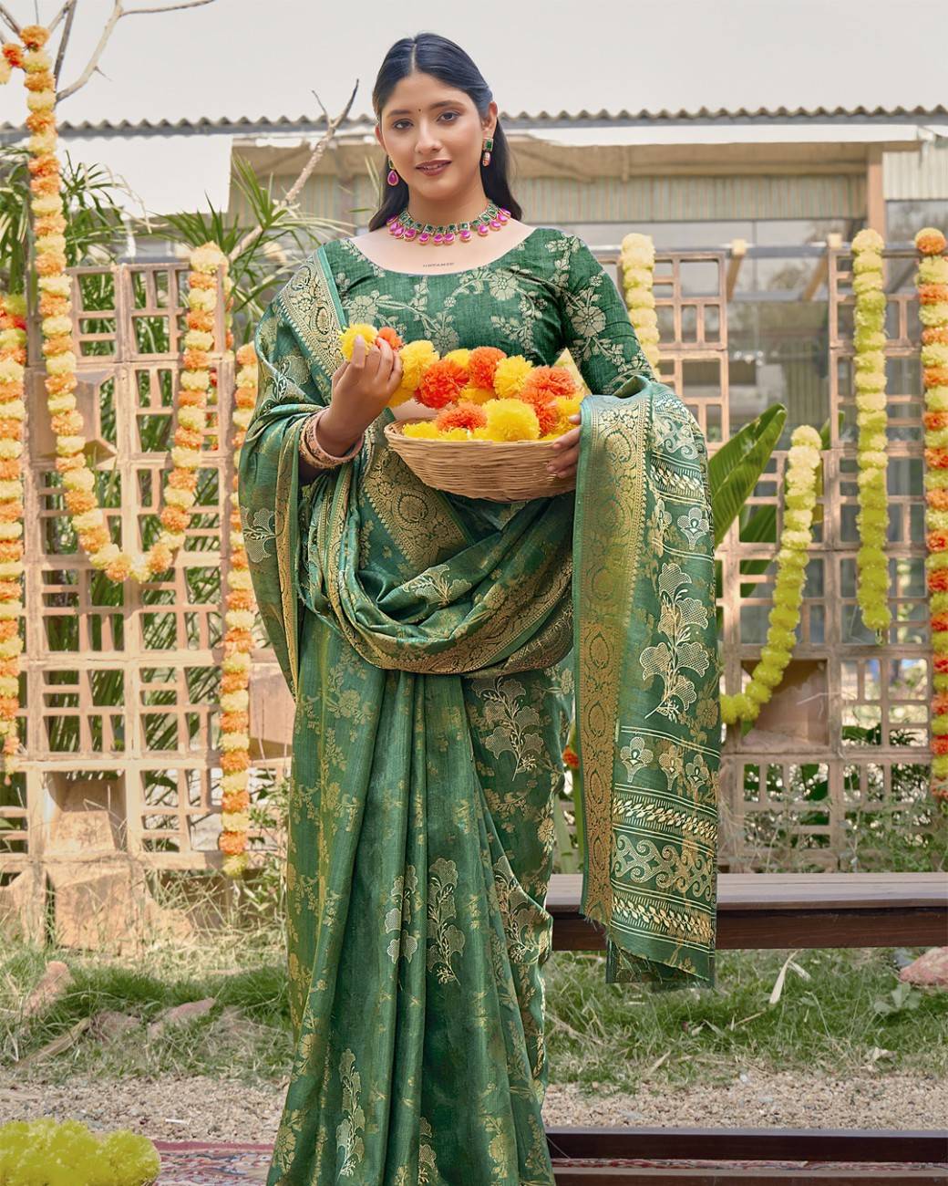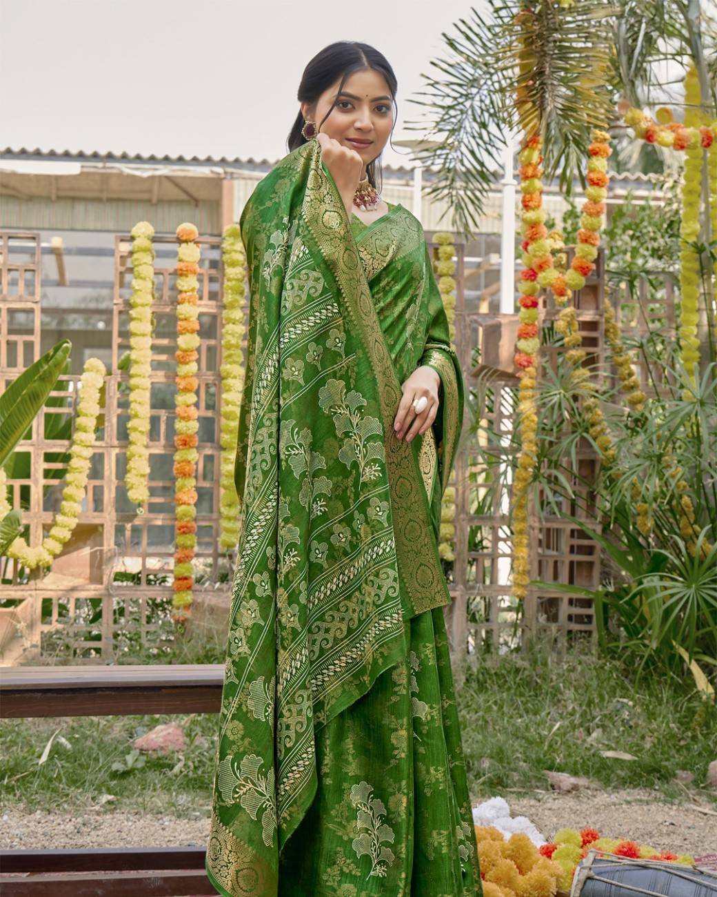 This silk saree pairs chic floral artistry with a smooth, flowing texture. The vibrant design and rich silk feel make it ideal for functions, celebrations, and festive wear.