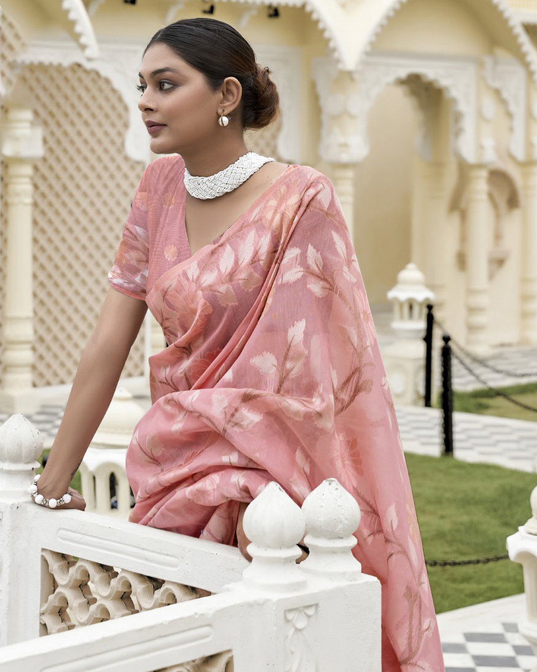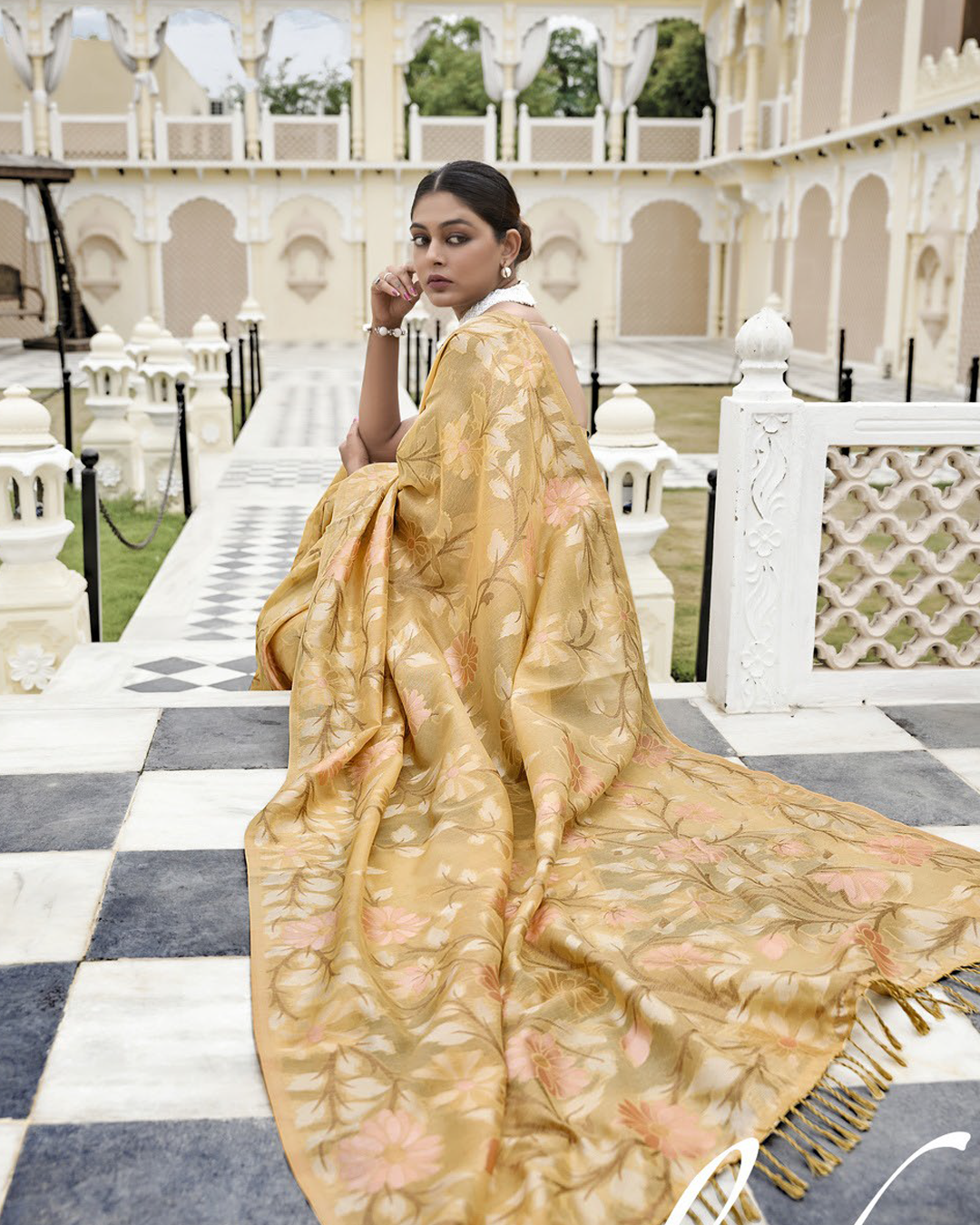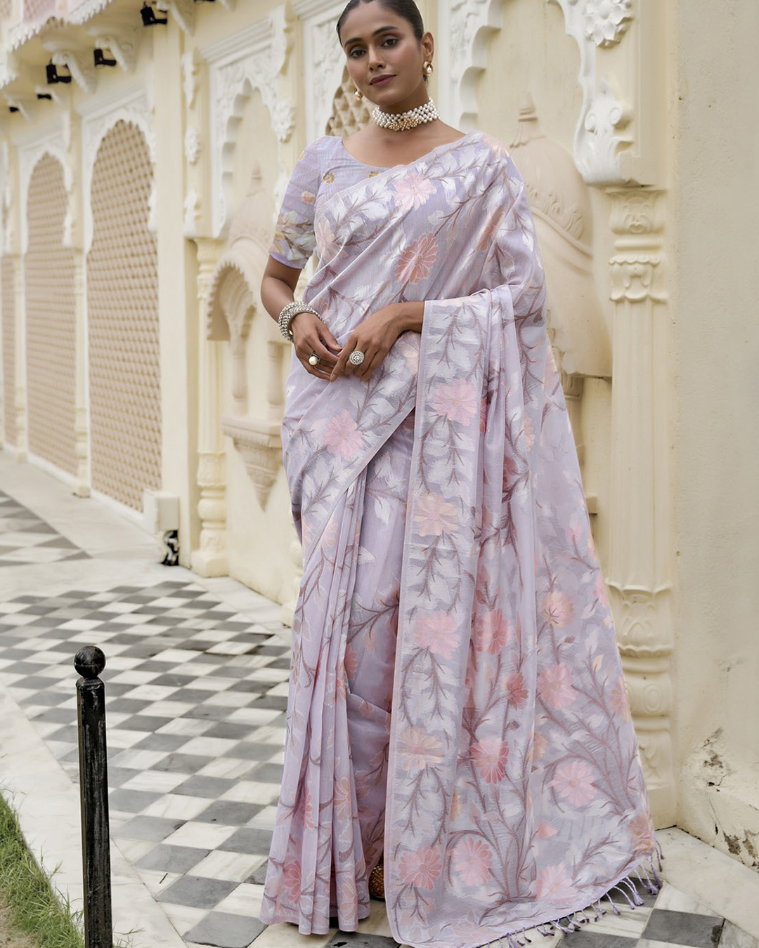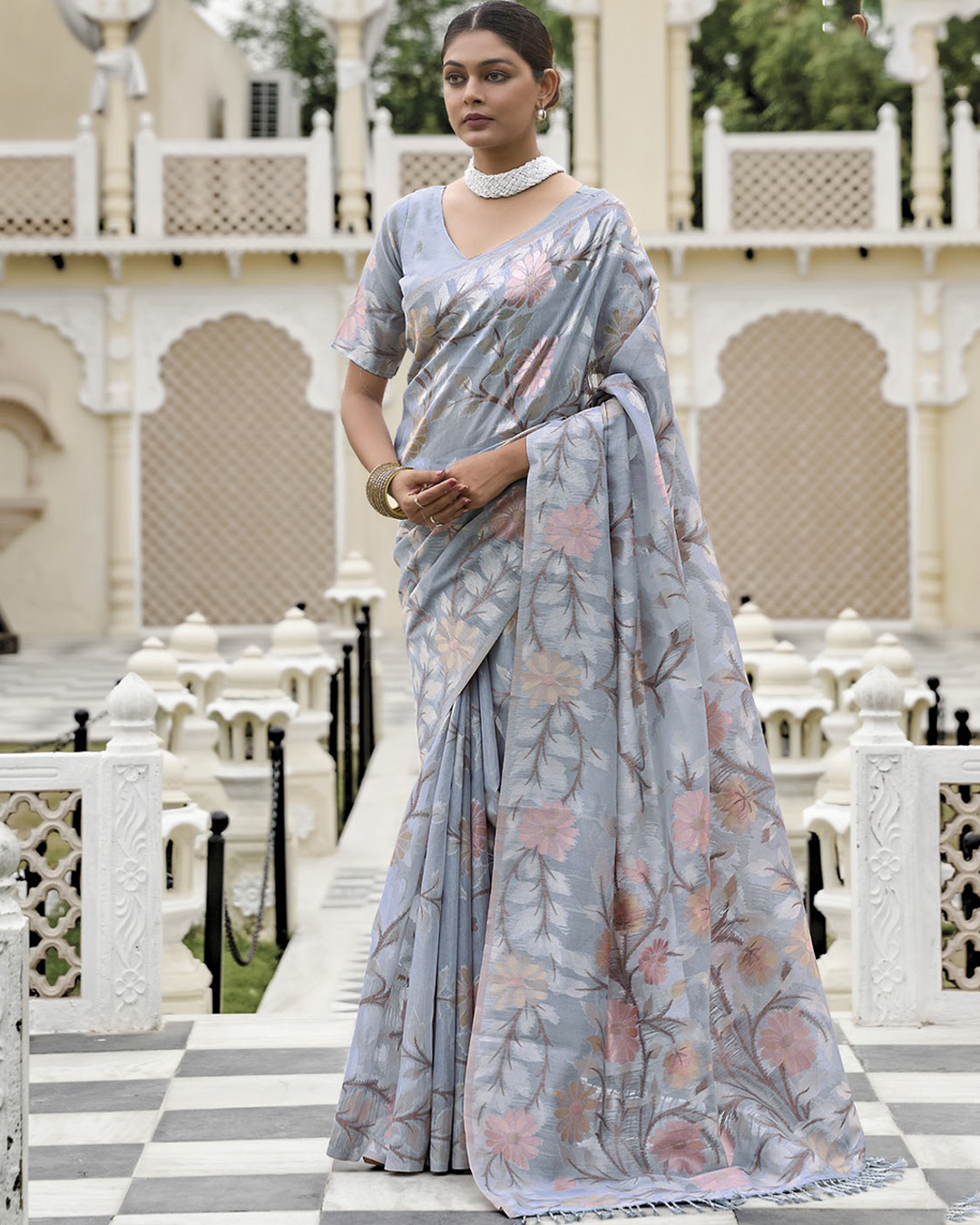 Kanshika is woven in fine Banglory Lilen and embellished with intricate Minakari Zari work, perfect for festive and wedding occasions.