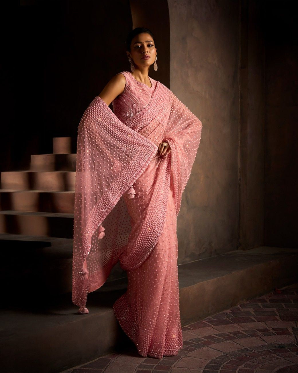 PearlNova dazzles with exquisite sequin detailing and delicate moti handwork on soft designer net. The saree flows with a luminous sparkle, while the perfectly stitched blouse gives a flawless, ready-to-wear fit. An elegant choice for parties, receptions, and festive celebrations.