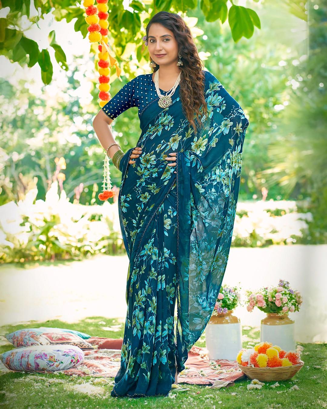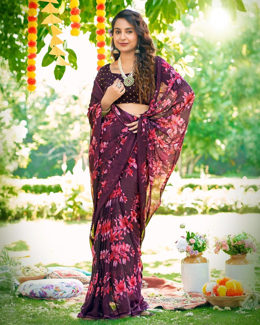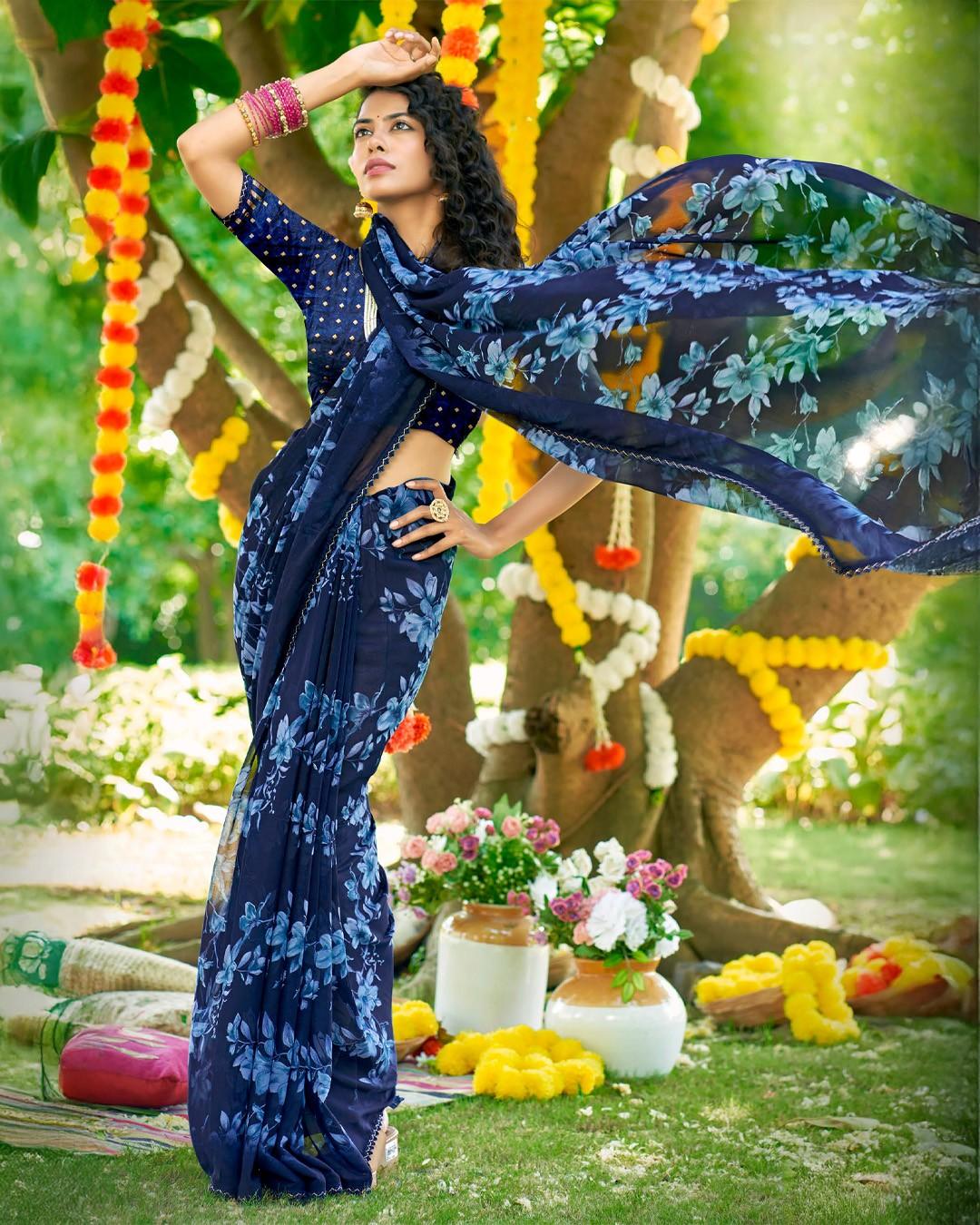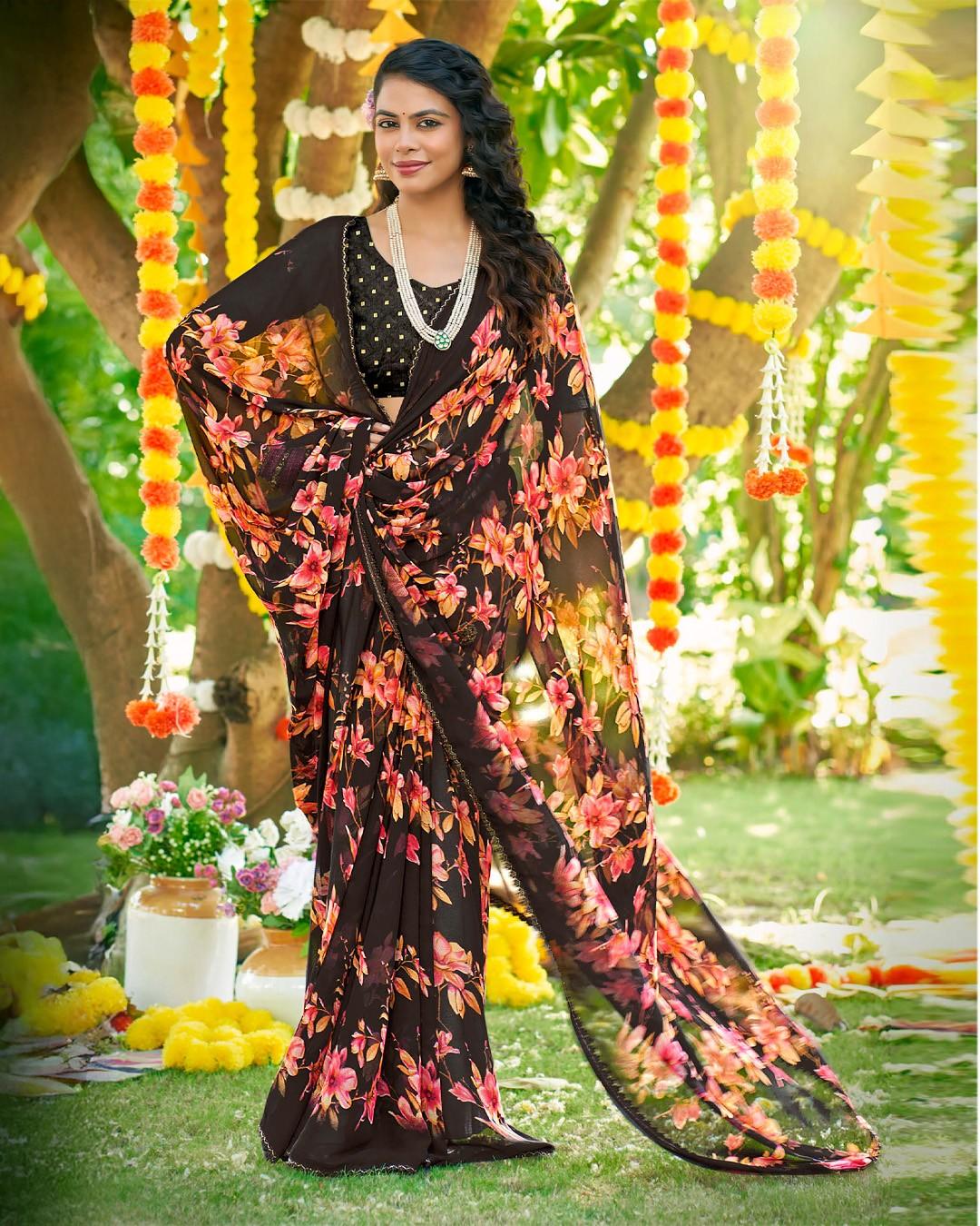 Inspired by morning gardens, this saree features misty floral motifs on flowy georgette, offering a soothing and stylish appearance.