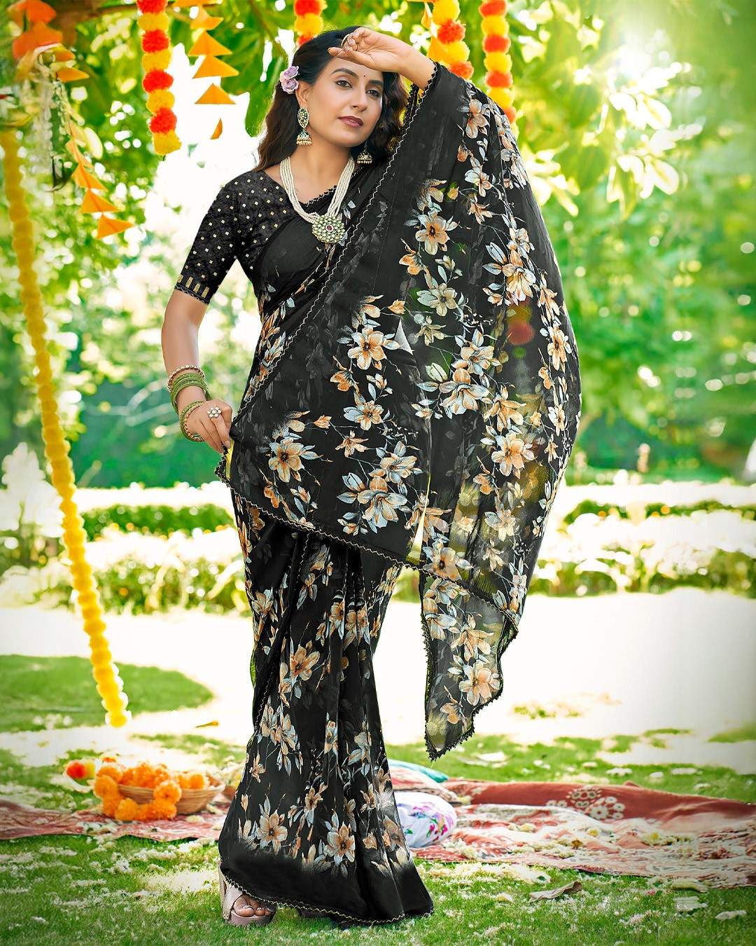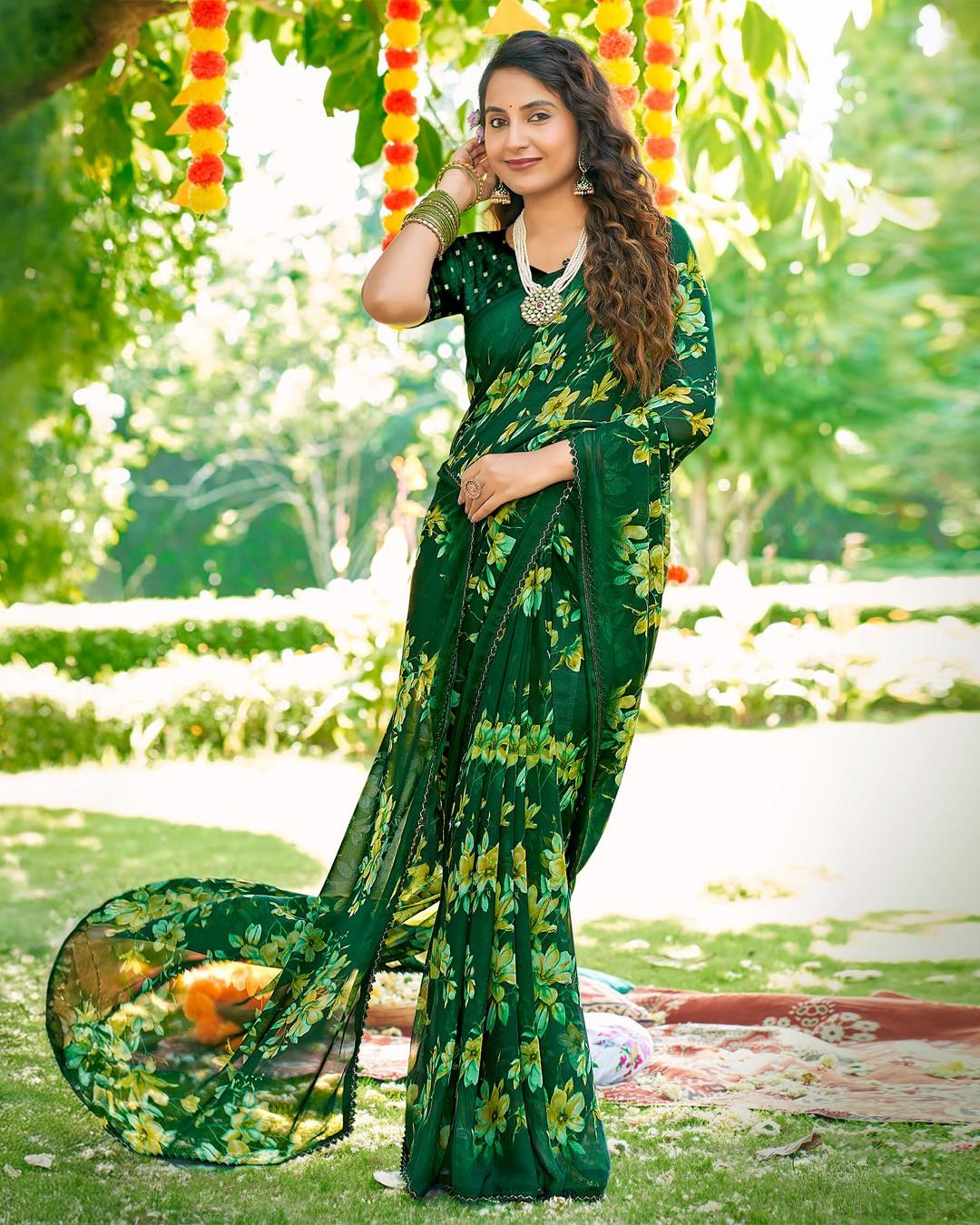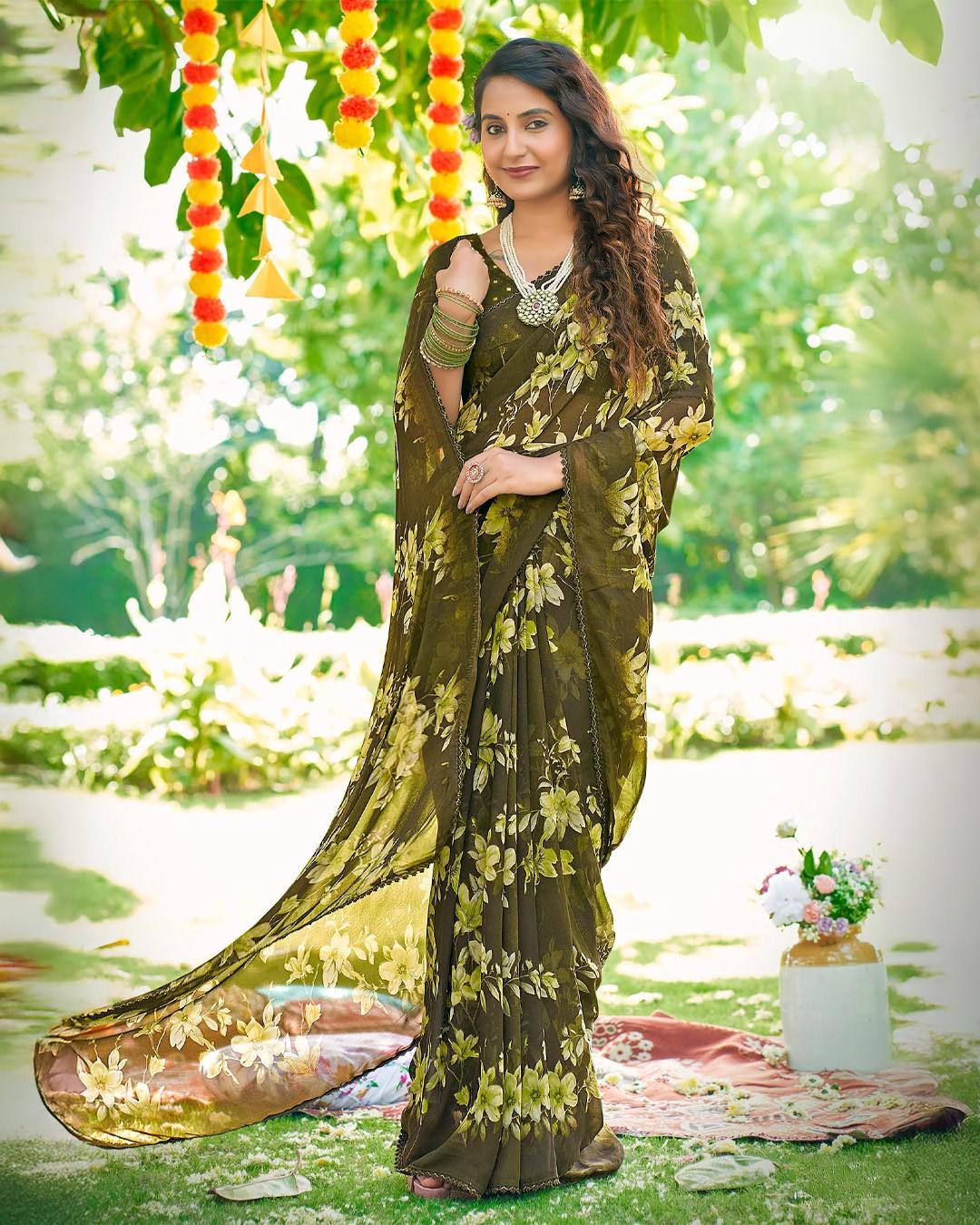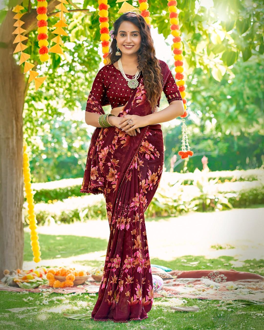 Inspired by morning gardens, this saree features misty floral motifs on flowy georgette, offering a soothing and stylish appearance.