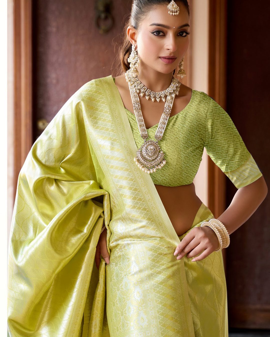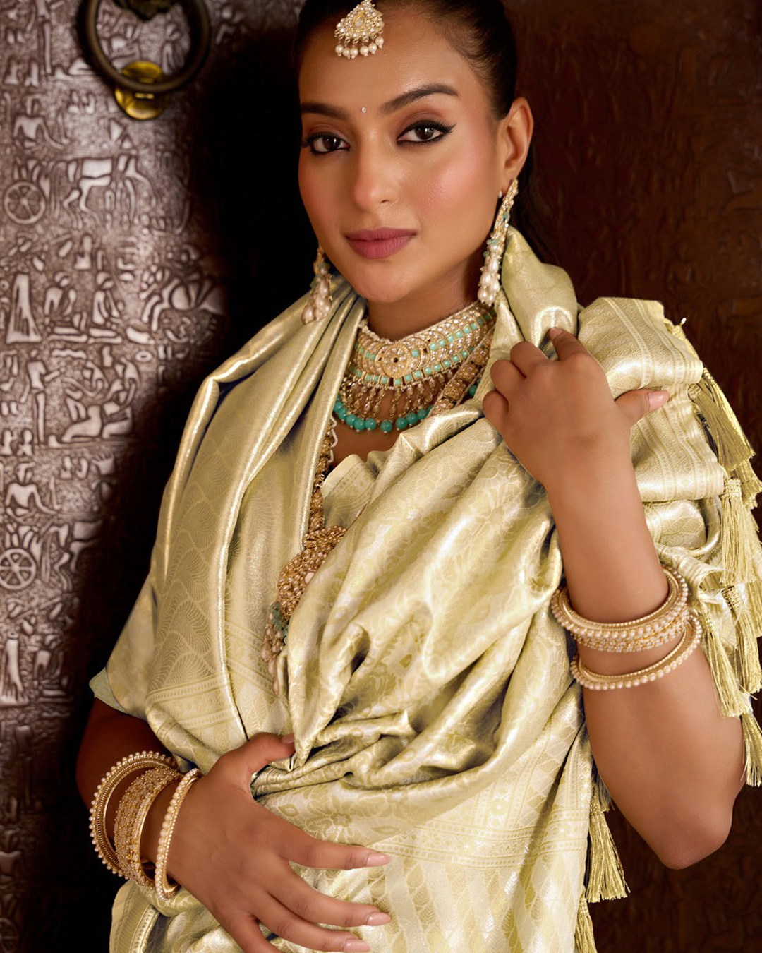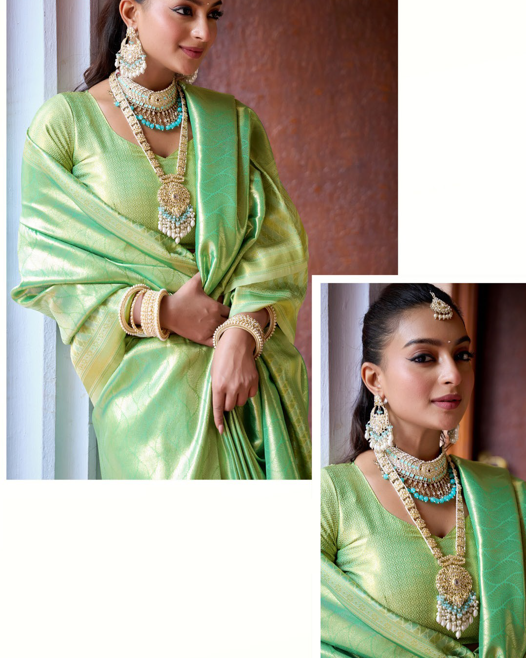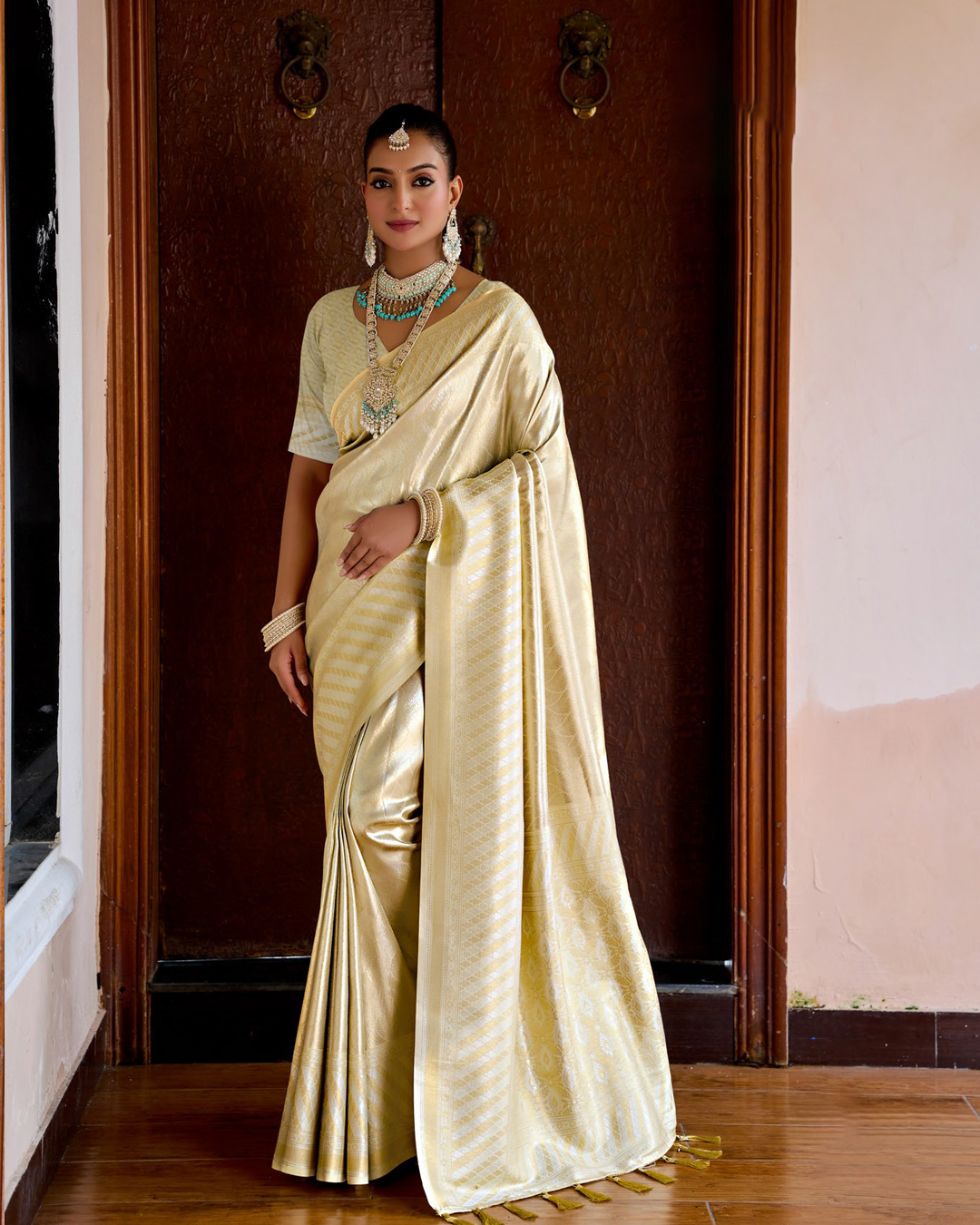 Inspired by golden winds, this Tissue Silk saree flows with sheer shine and ethereal beauty.