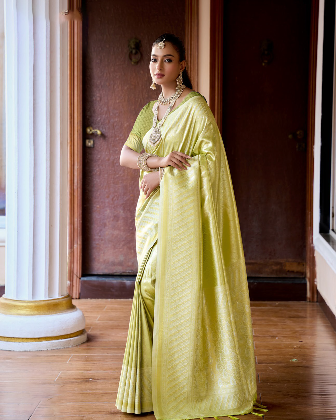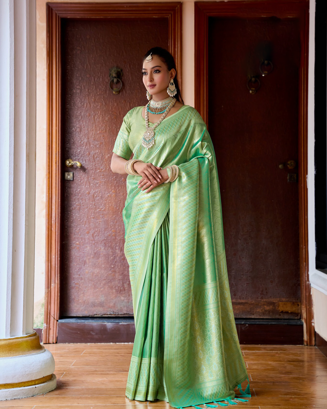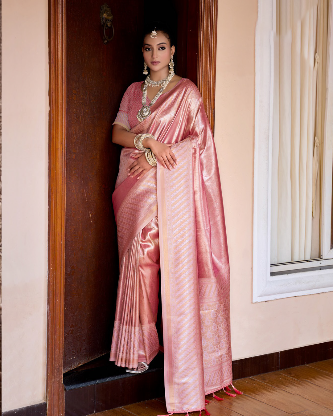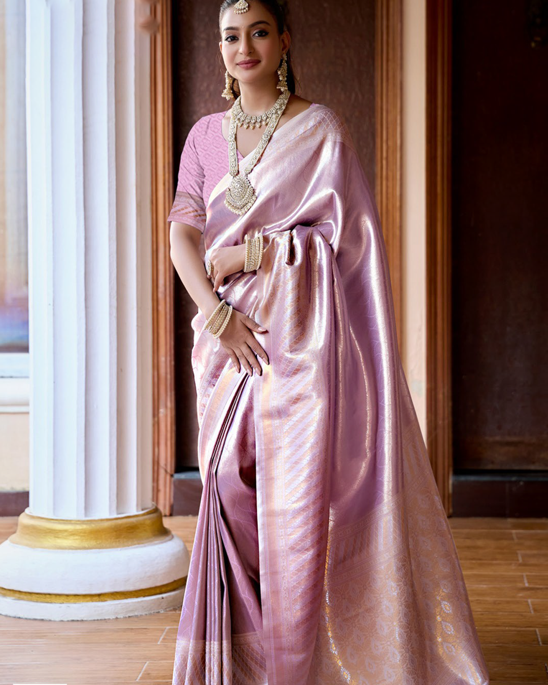 Inspired by golden winds, this Tissue Silk saree flows with sheer shine and ethereal beauty.