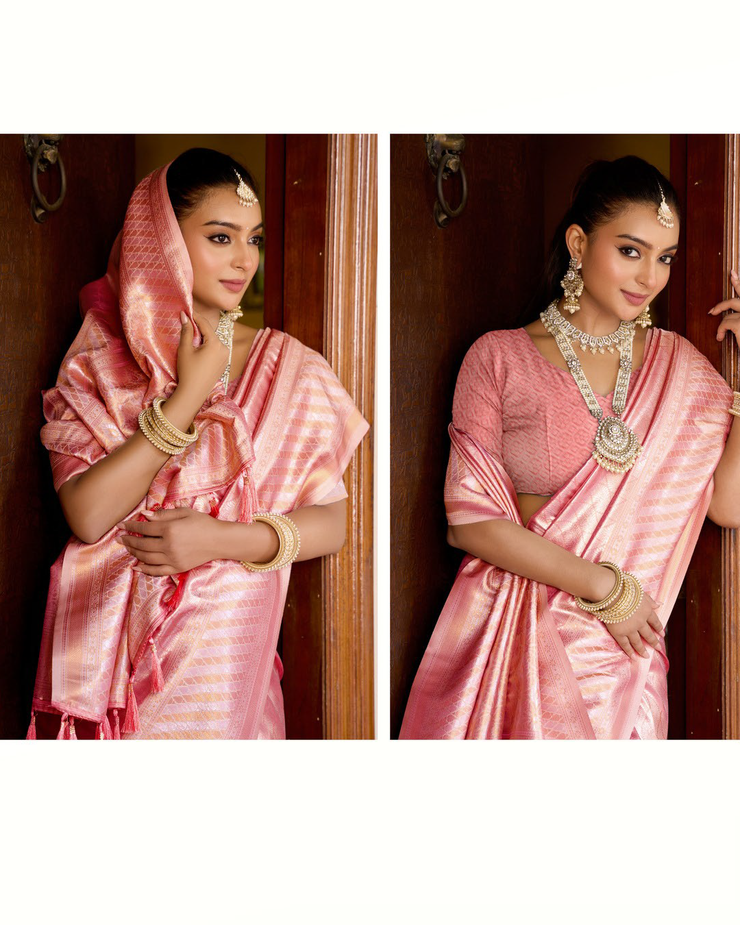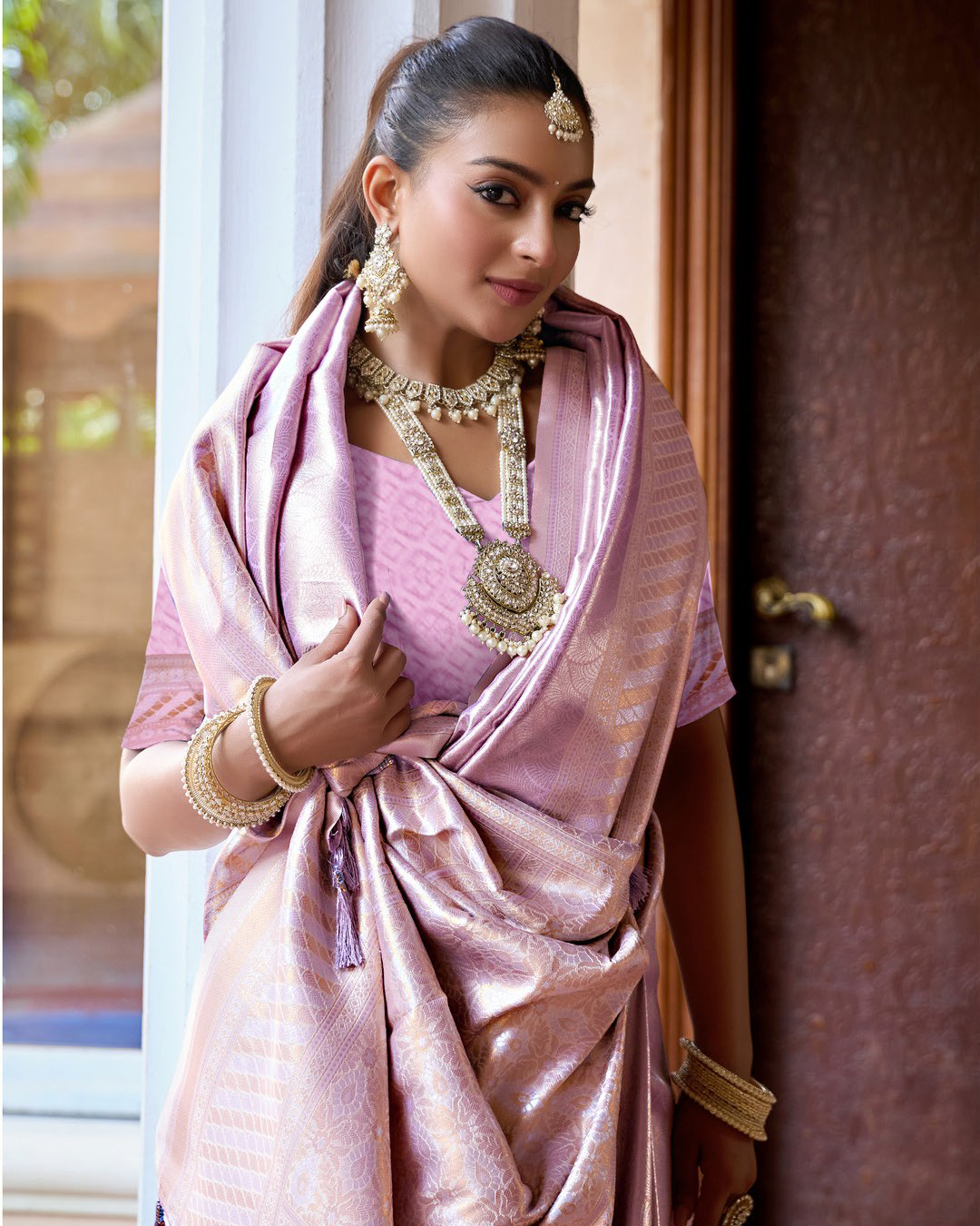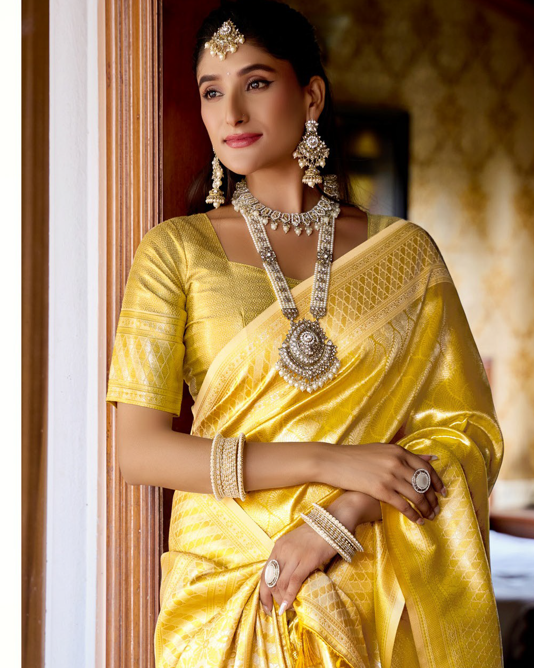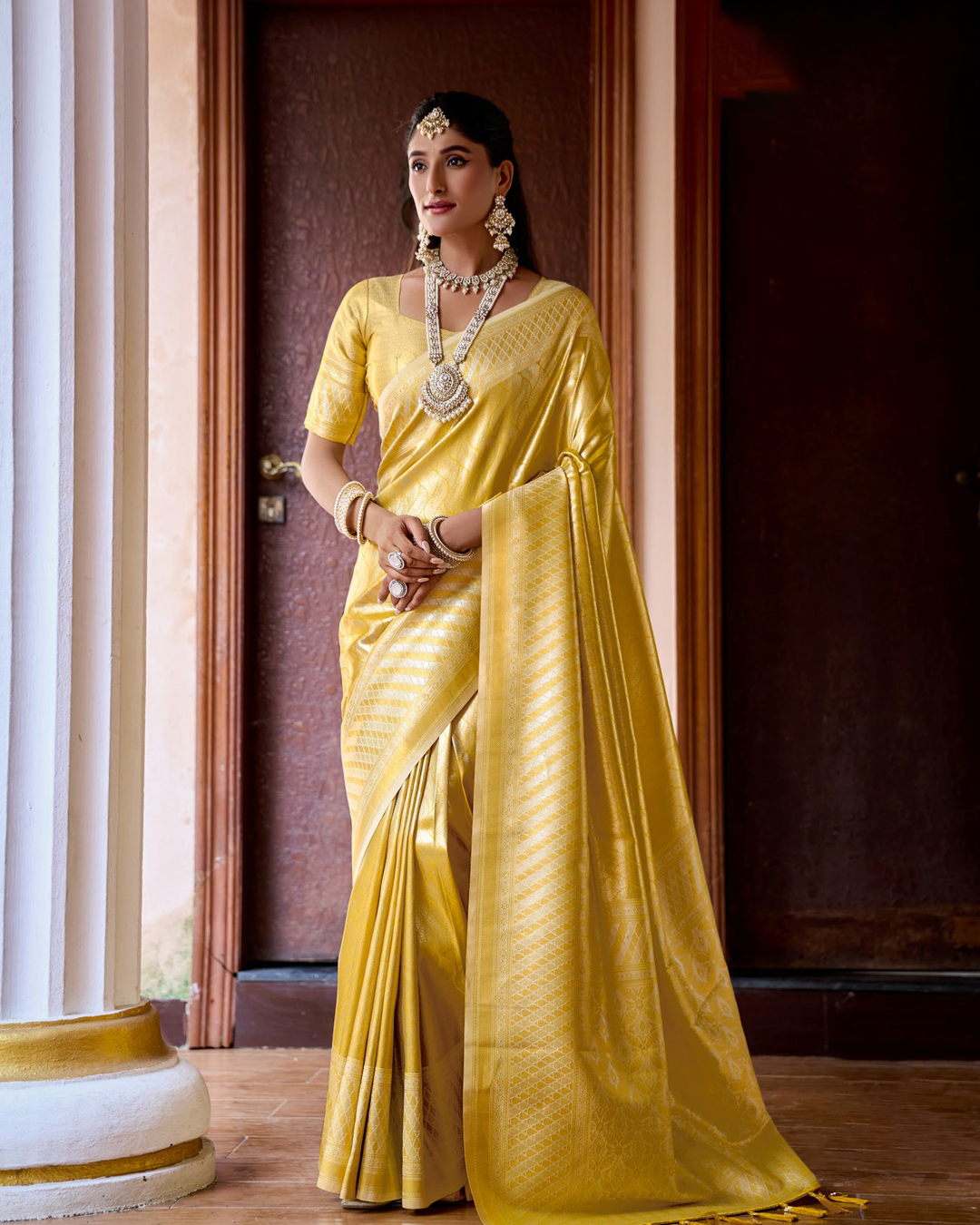 Inspired by golden winds, this Tissue Silk saree flows with sheer shine and ethereal beauty.